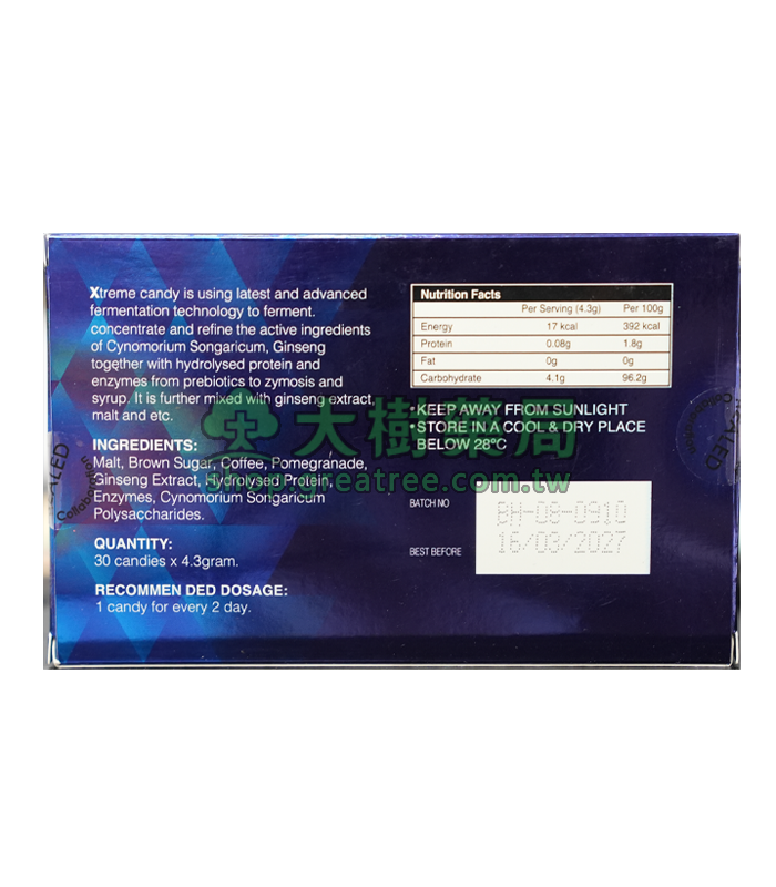 三代汗馬糖藍糖(Xtreme)歷經15年研發而成,是馬來西亞原裝進口的一款精力糖,在台灣也叫悍馬糖、hamer糖、汗馬精力糖。汗馬糖主要成分為鎖陽、人參,主要功效是補益陽氣,養筋健骨,補氣養血,緩解血虛型便秘,汗馬精力糖由於快速補充人體細胞營養,延緩老化進程非常有效,數年來已成為運動員首選的細胞營養產品。